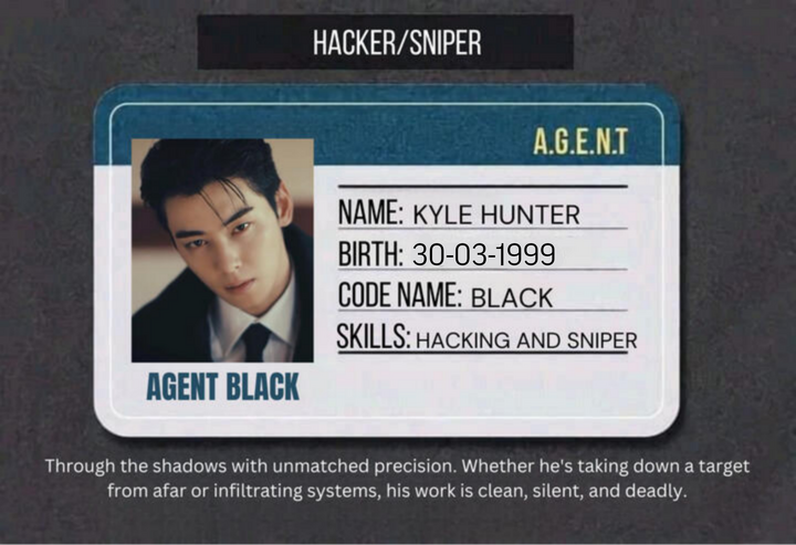 KYLE ZANE HUNTER, born KANG SOO HYUN,(강수현) grew up in a wealthy family in Seoul, South Korea. His father, Kang Ji-ho, a powerful businessman, had high expectations for Kyle to follow in his footsteps.While Kyle was loved and spoiled with lavish gifts, the emotional distance between him and his father created tension.His mother, Lee So-young, provided the warmth and emotional support he needed, becoming his anchor in a family dominated by ambition and expectations.Kyle’s life took a sharp turn when he was 16. His younger sister, Mina, tragically passed away.This loss deeply affected him, leading him to reject his Korean name, as it reminded him of the life he wanted to leave behind. Adopting the name "Kyle," he sought freedom from his family's rigid expectations and the weight of his grief.He turned to motorcycles, literature, and poetry as outlets for his emotions, embracing a rebellious and adventurous lifestyle.Driven by a desire for revenge and purpose, Kyle ventured into the world of secret missions, earning the code name "Agent Black." His skills as a sniper and hacker set him apart, but the job came with its own challenges, forcing him to navigate the complexities of a double life.